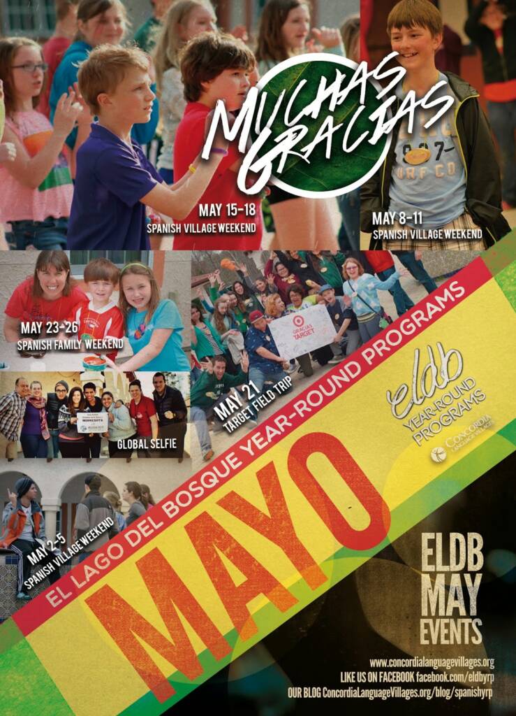 Cartel con las actividades mensuales en el campamento de inmersión en Español El Lago del Bosque, parte de Concordia Language Villages.